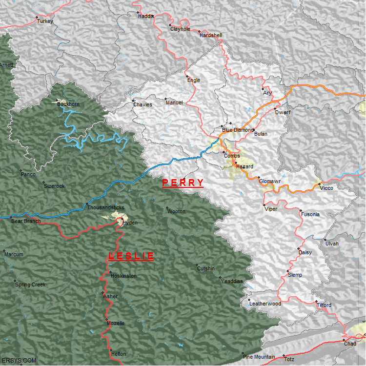 Perry County, KY (shown in white) has 339.72 mi² of land area and 2.89 mi² of water resources. The county is bordered by: