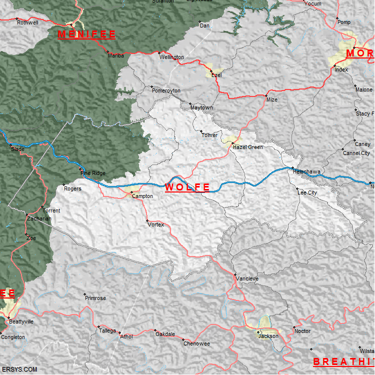 Wolfe County, KY (shown in white) has 222.16 mi² of land area and 0.59 mi² of water resources. The county is bordered by: