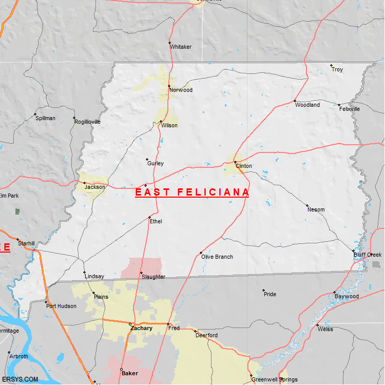 The estimated population of East Feliciana Parish is 19,792 with 6,989 households. These households are spread across 5 unique municipalties (not all shown).