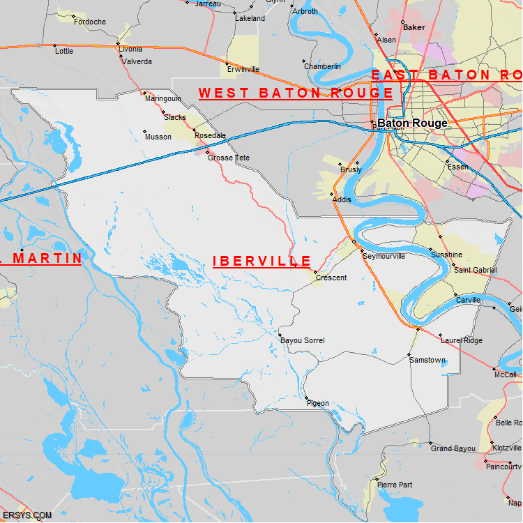 The estimated population of Iberville Parish is 30,695 with 11,396 households. These households are spread across 9 unique municipalties (not all shown).