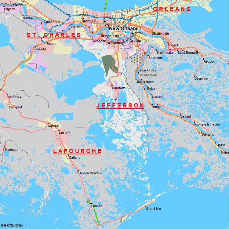 Jefferson Parish, LA (shown in white) has 300.86 mi² of land area and 341.17 mi² of water resources. The county is bordered by: