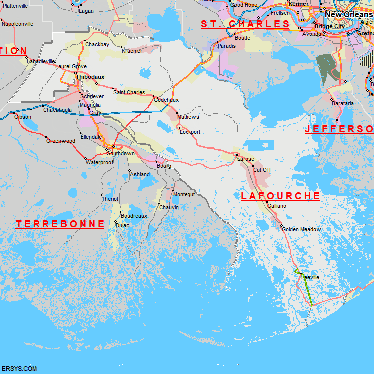 The estimated population of Lafourche Parish is 96,457 with 36,777 households. These households are spread across 15 unique municipalties (not all shown).