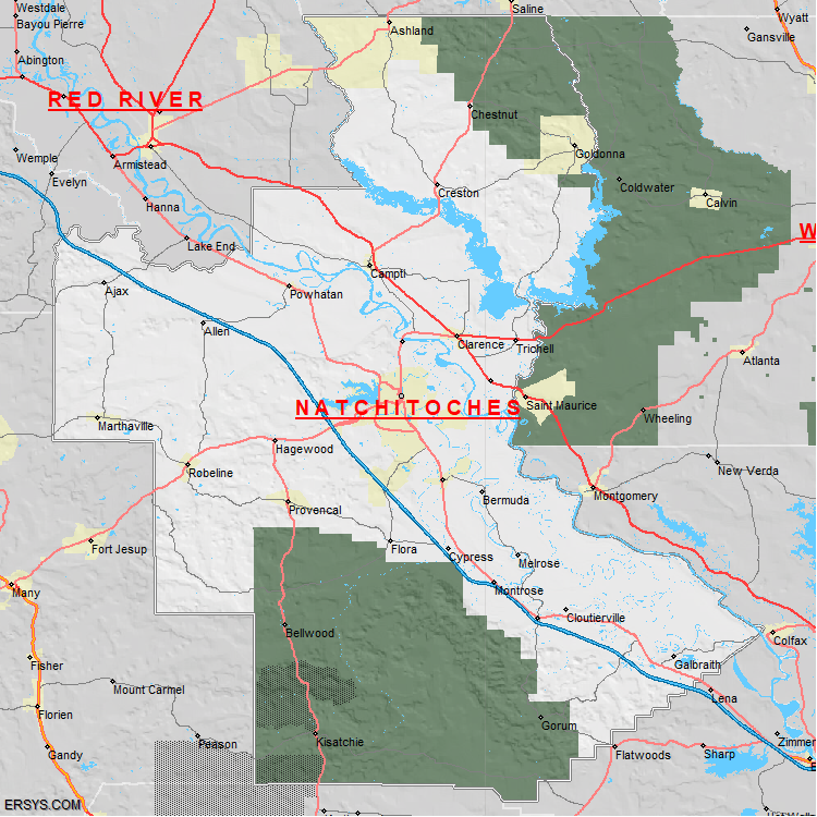 Natchitoches Parish, LA (shown in white) has 1,253.32 mi² of land area and 46.23 mi² of water resources. The county is bordered by: