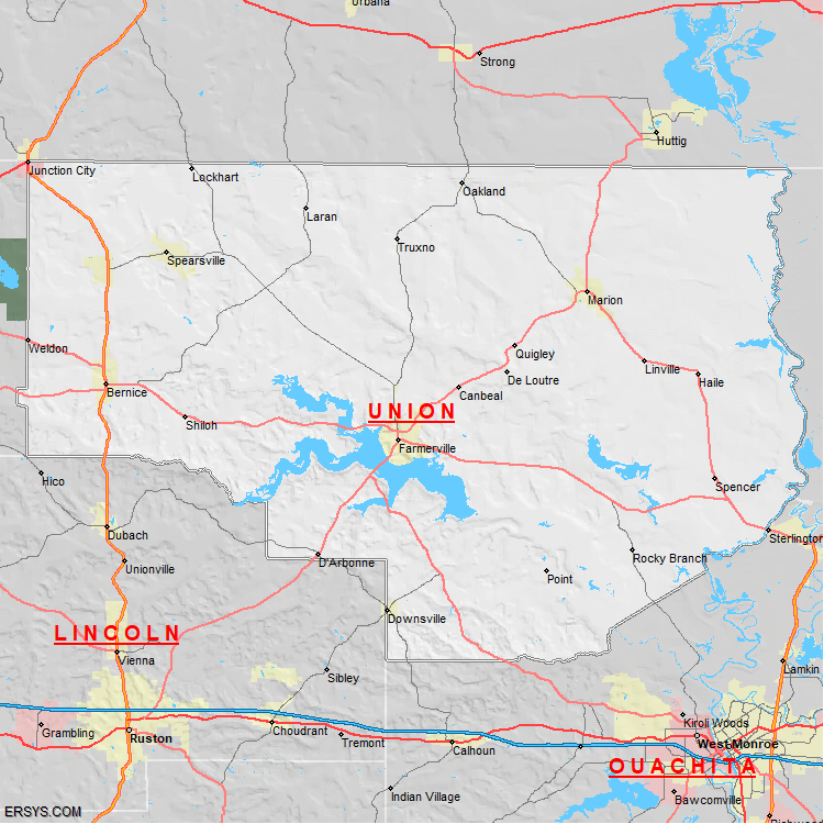 The estimated population of Union Parish is 21,360 with 8,868 households. These households are spread across 7 unique municipalties (not all shown).