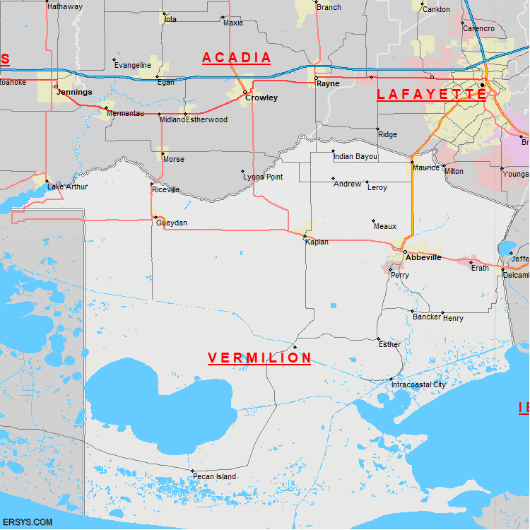 The estimated population of Vermilion Parish is 57,605 with 22,265 households. These households are spread across 7 unique municipalties (not all shown).