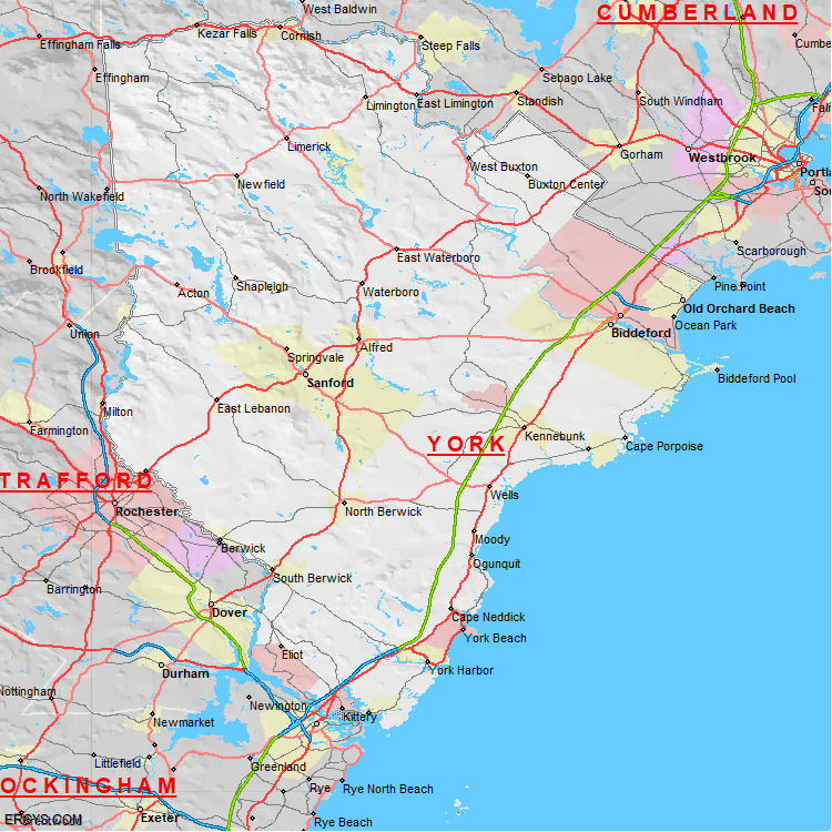 York County, ME (shown in white) has 991.2 mi² of land area and 278.52 mi² of water resources. The county is bordered by: