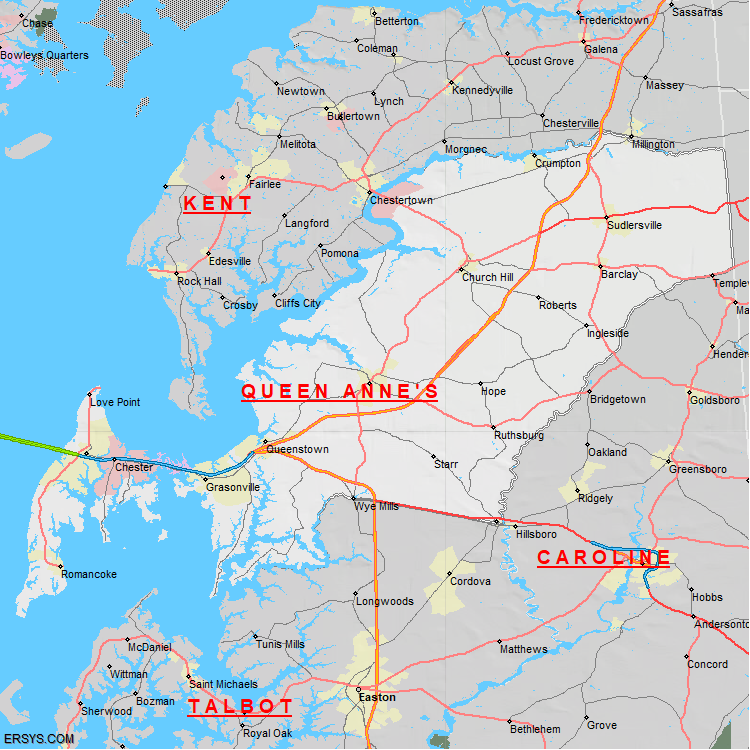 Queen Anne's County, MD (shown in white) has 371.67 mi² of land area and 139.03 mi² of water resources. The county is bordered by: