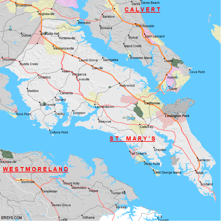 St. Mary's County, MD (shown in white) has 358.56 mi² of land area and 405.69 mi² of water resources. The county is bordered by: