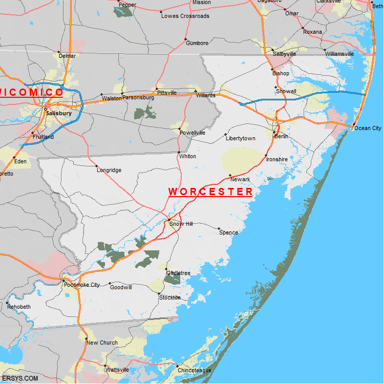 Worcester County, MD (shown in white) has 468.4 mi² of land area and 226.46 mi² of water resources. The county is bordered by: