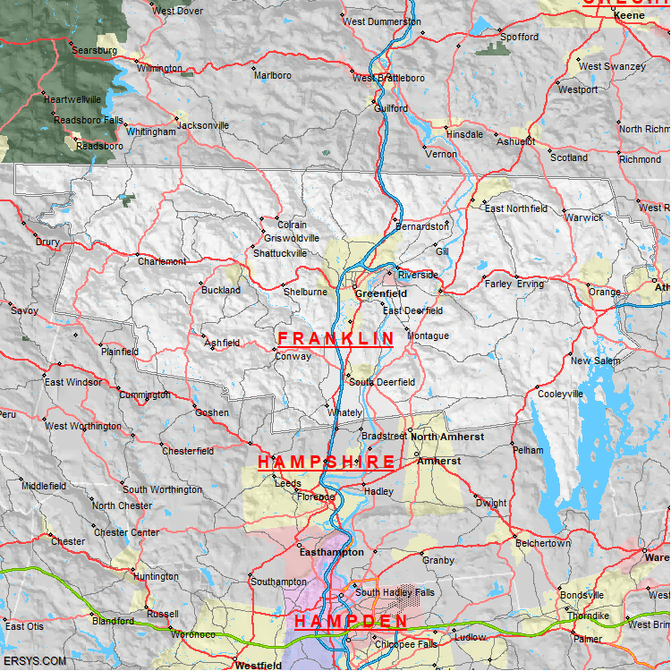 Franklin County, MA (shown in white) has 699.21 mi² of land area and 25.33 mi² of water resources. The county is bordered by: