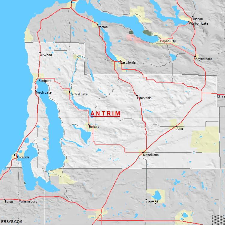 Antrim County, MI (shown in white) has 475.68 mi² of land area and 126.08 mi² of water resources. The county is bordered by: