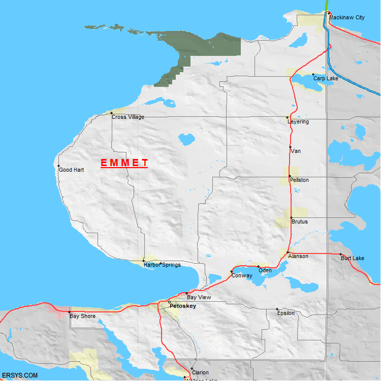 Emmet County, MI (shown in white) has 467.55 mi² of land area and 414.45 mi² of water resources. The county is bordered by:
