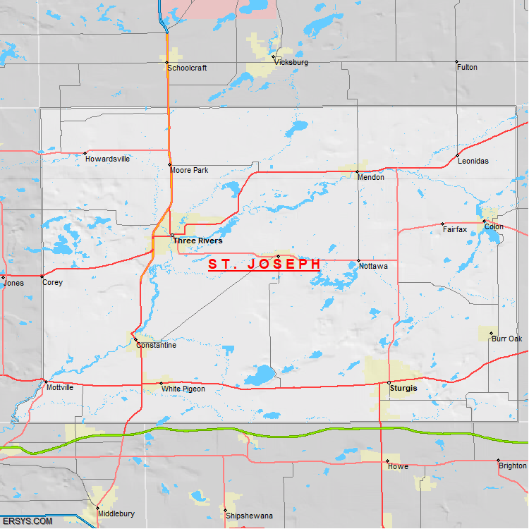 St. Joseph County, MI (shown in white) has 500.64 mi² of land area and 20.39 mi² of water resources. The county is bordered by: