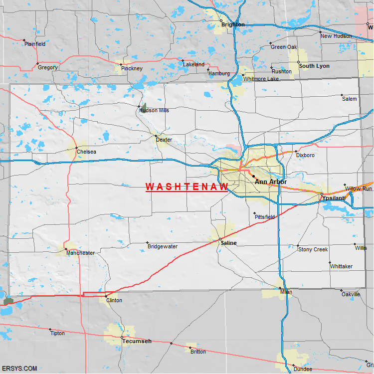 Washtenaw County, MI (shown in white) has 706 mi² of land area and 16.42 mi² of water resources. The county is bordered by: