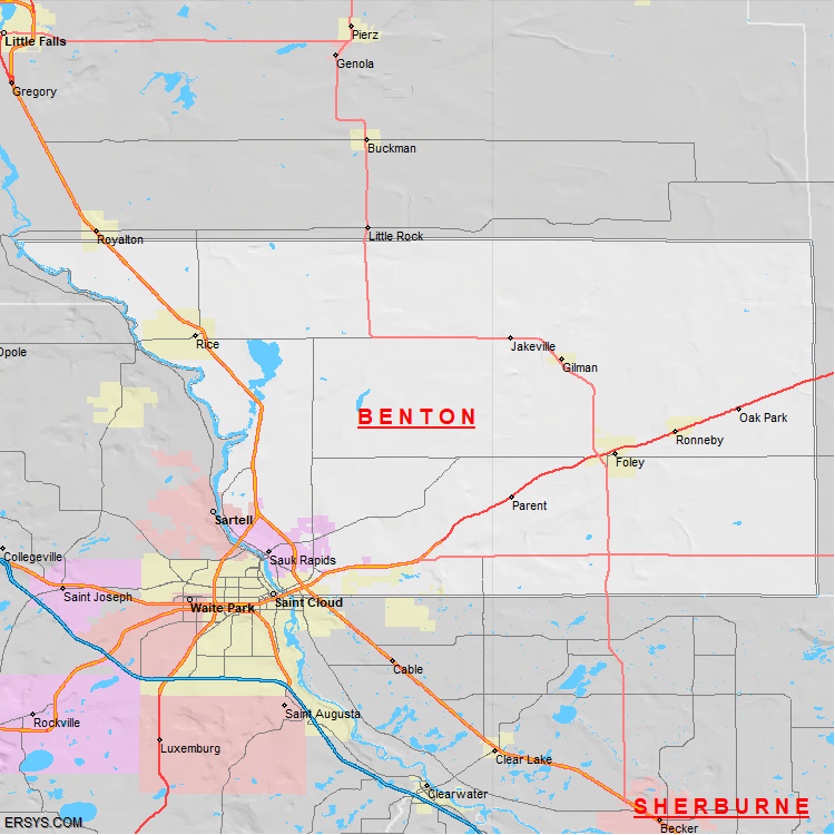 Benton County, MN (shown in white) has 408.3 mi² of land area and 4.74 mi² of water resources. The county is bordered by: