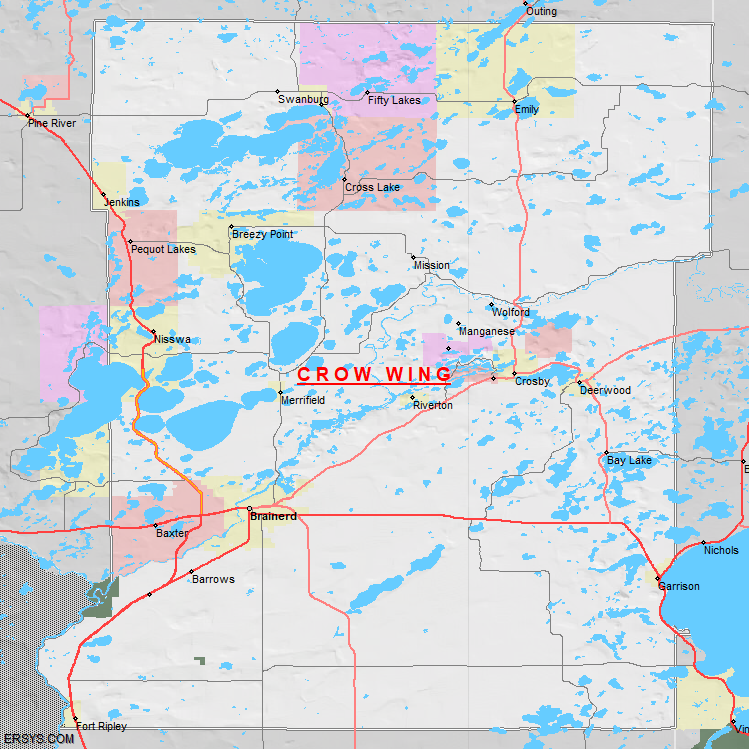 The estimated population of Crow Wing County is 69,211 with 29,232 households. These households are spread across 19 unique municipalties (not all shown).