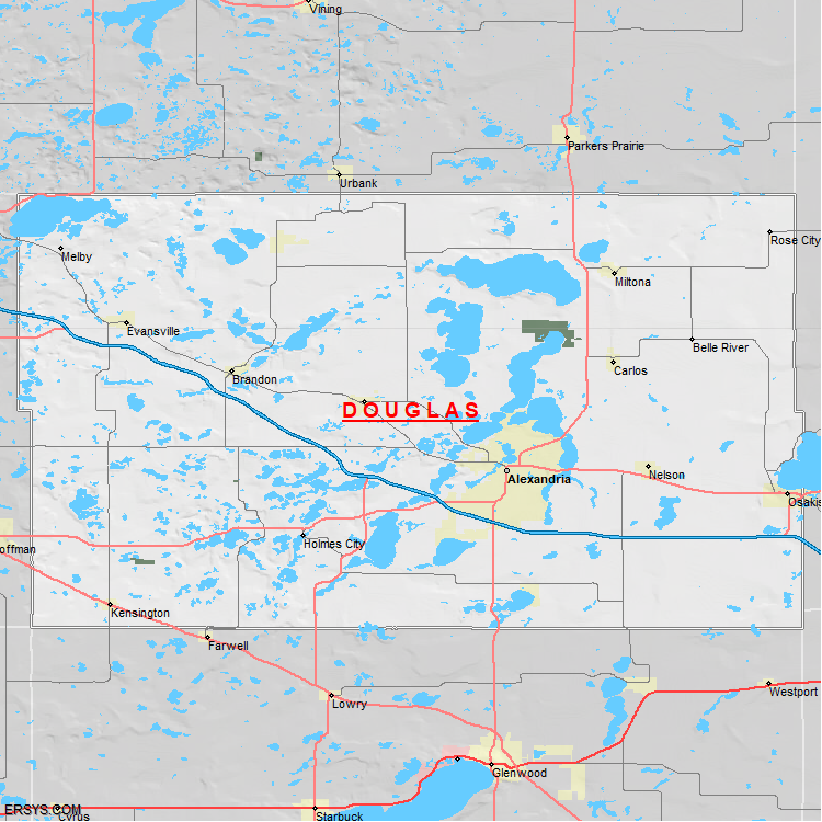 Douglas County, MN (shown in white) has 636.88 mi² of land area and 83.3 mi² of water resources. The county is bordered by: