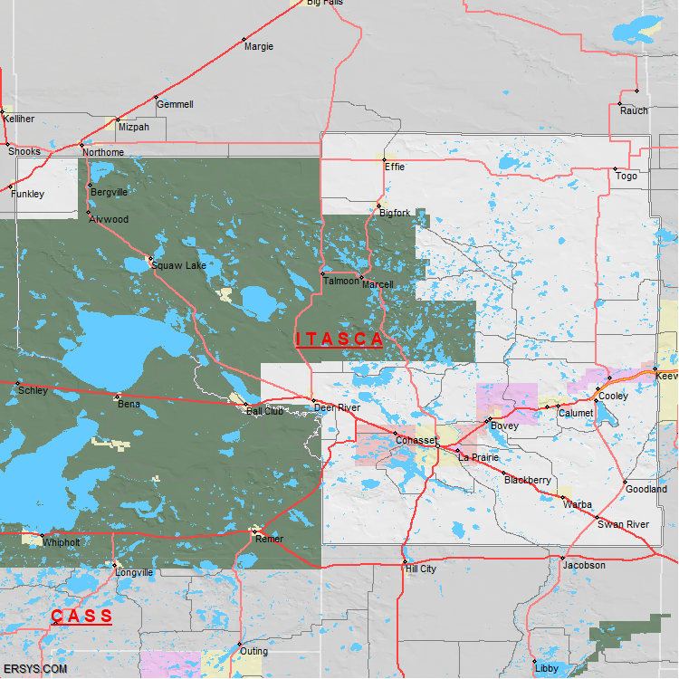 The estimated population of Itasca County is 45,922 with 19,377 households. These households are spread across 19 unique municipalties (not all shown).