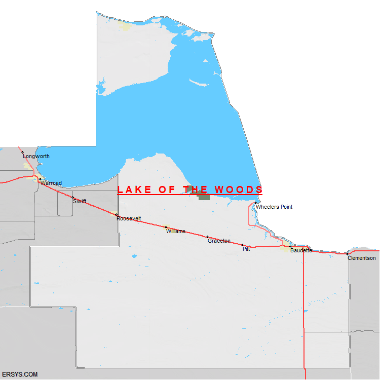 The estimated population of Lake of the Woods County is 3,737 with 1,733 households. These households are spread across 3 unique municipalties (not all shown).