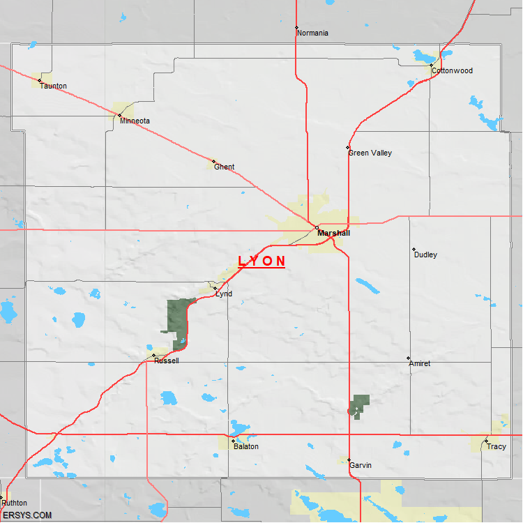 The estimated population of Lyon County is 25,482 with 10,242 households. These households are spread across 11 unique municipalties (not all shown).