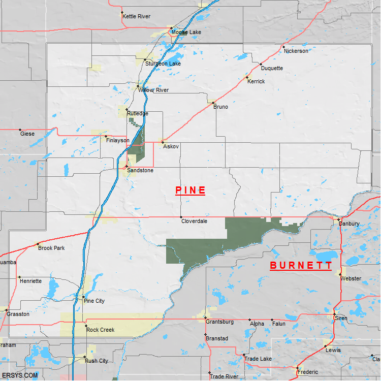 The estimated population of Pine County is 30,474 with 12,111 households. These households are spread across 14 unique municipalties (not all shown).