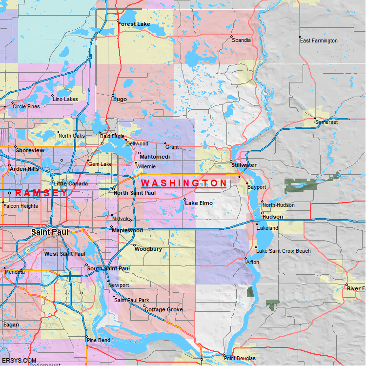 Washington County, MN (shown in white) has 384.72 mi² of land area and 38.59 mi² of water resources. The county is bordered by: