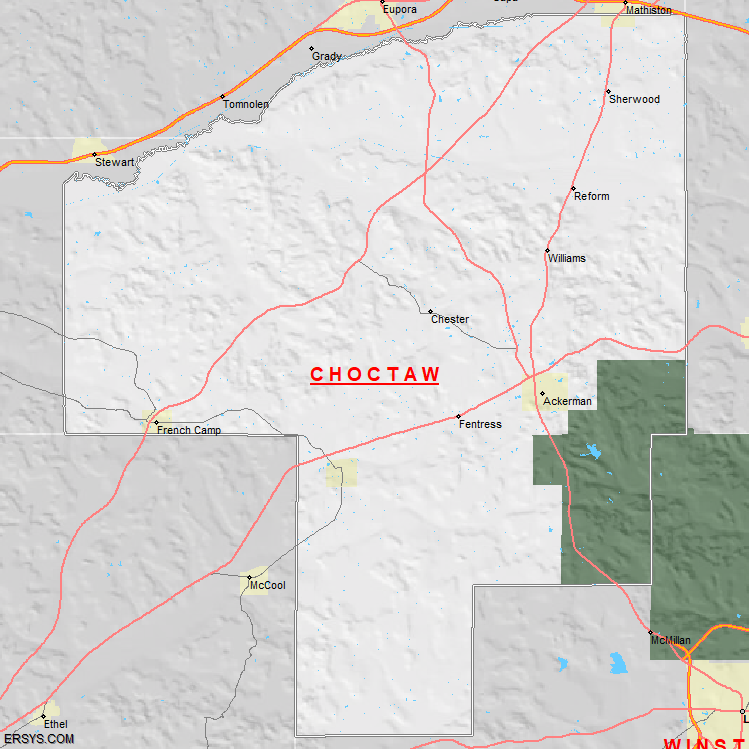 The estimated population of Choctaw County is 8,400 with 3,518 households. These households are spread across 3 unique municipalties (not all shown).