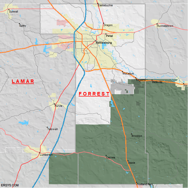 The estimated population of Forrest County is 79,399 with 30,474 households. These households are spread across 5 unique municipalties (not all shown).