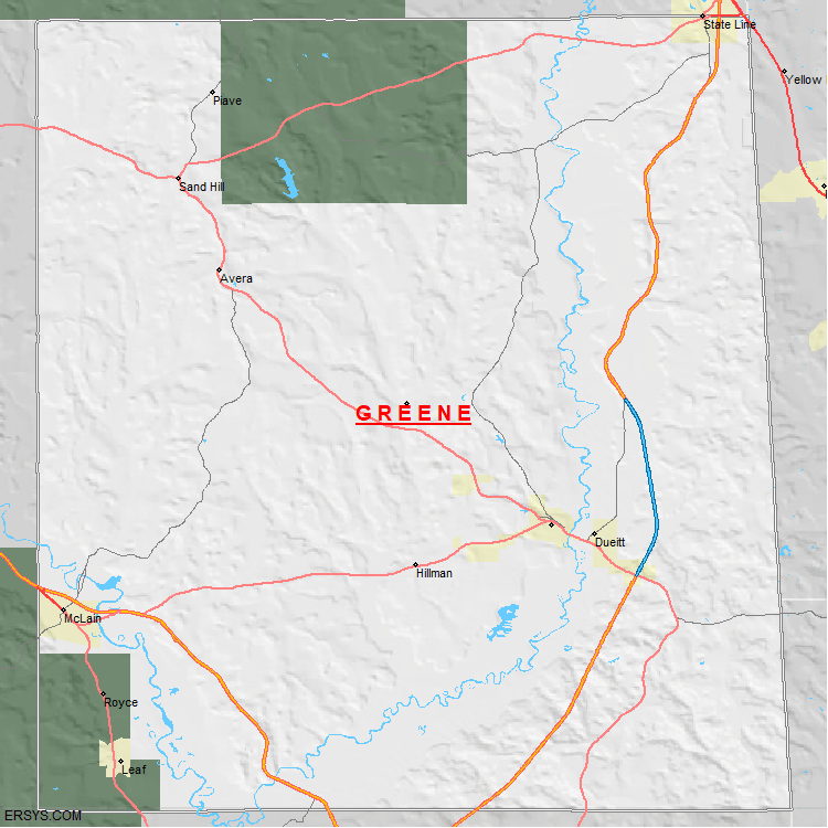 Greene County, MS (shown in white) has 712.74 mi² of land area and 5.96 mi² of water resources. The county is bordered by: