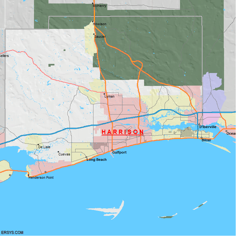 The estimated population of Harrison County is 212,419 with 83,010 households. These households are spread across 9 unique municipalties (not all shown).