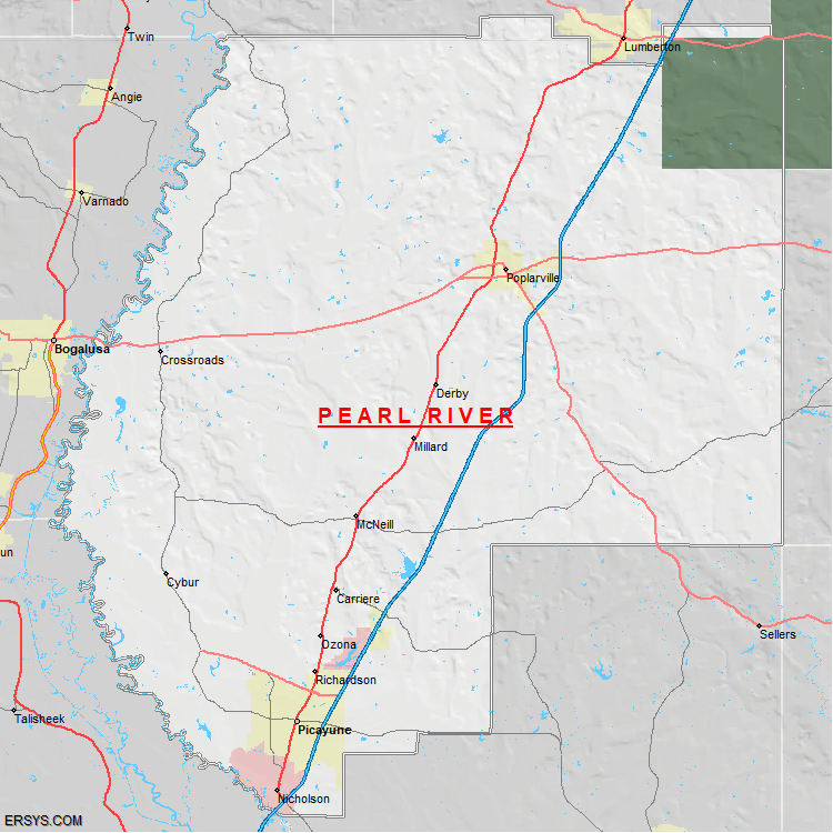The estimated population of Pearl River County is 58,400 with 22,568 households. These households are spread across 4 unique municipalties (not all shown).