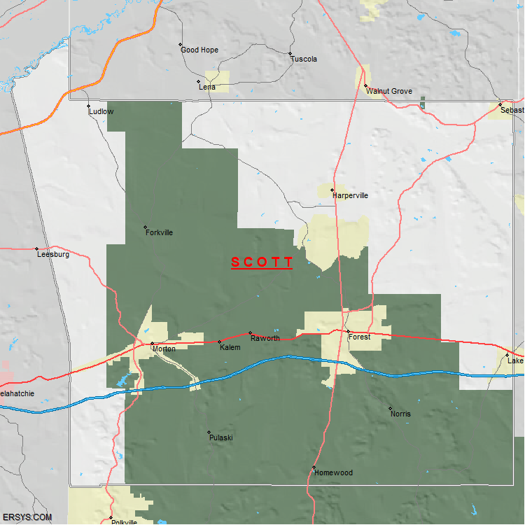 Scott County, MS (shown in white) has 609.23 mi² of land area and 1.16 mi² of water resources. The county is bordered by: