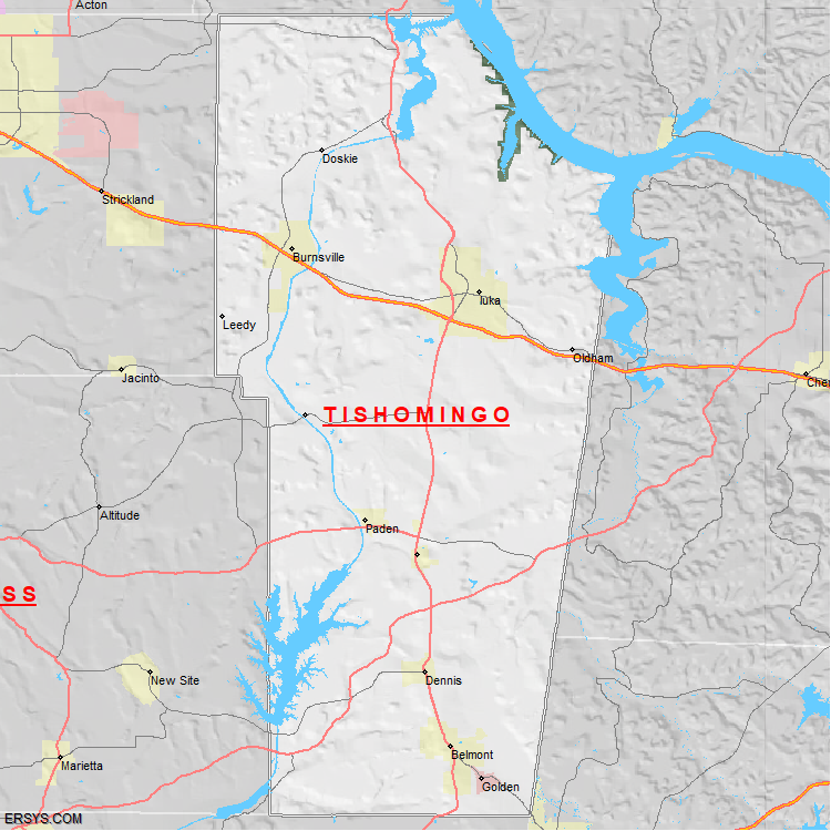 The estimated population of Tishomingo County is 19,027 with 7,994 households. These households are spread across 7 unique municipalties (not all shown).