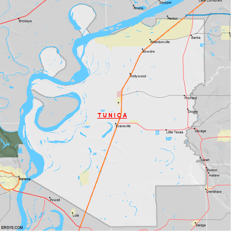 The estimated population of Tunica County is 9,873 with 3,859 households. These households are spread across 6 unique municipalties (not all shown).