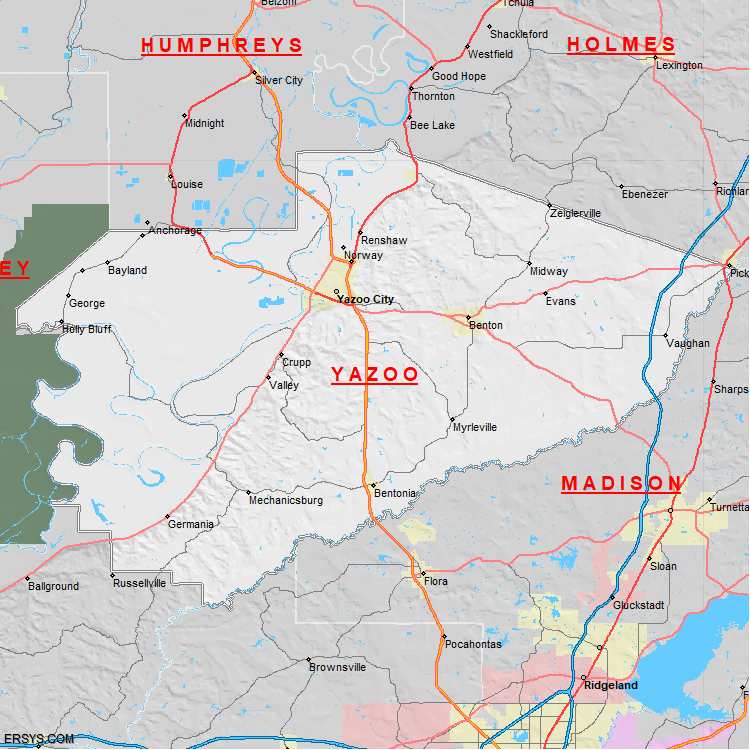 Yazoo County, MS (shown in white) has 922.34 mi² of land area and 11.82 mi² of water resources. The county is bordered by: