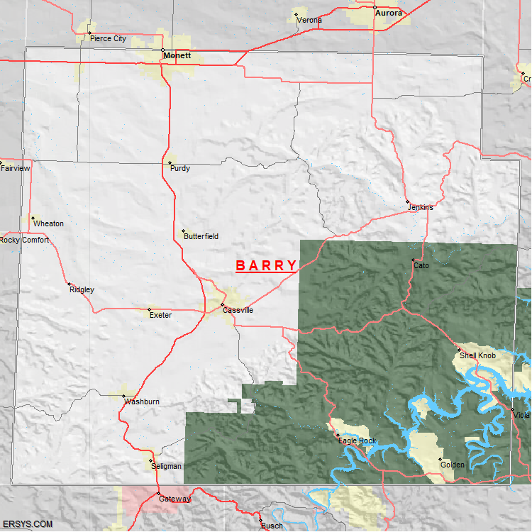 Barry County, MO (shown in white) has 778.12 mi² of land area and 12.71 mi² of water resources. The county is bordered by: