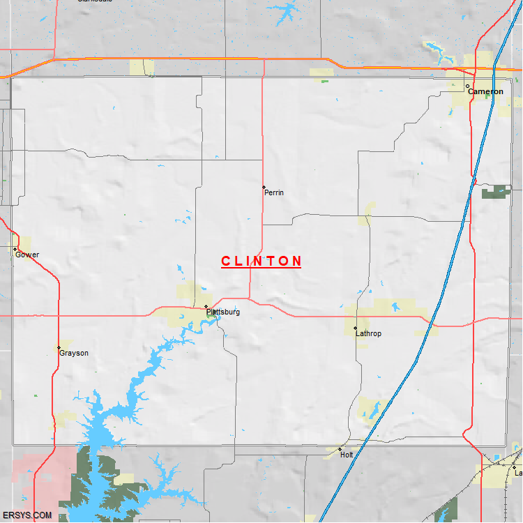 Clinton County, MO (shown in white) has 418.94 mi² of land area and 4.54 mi² of water resources. The county is bordered by: