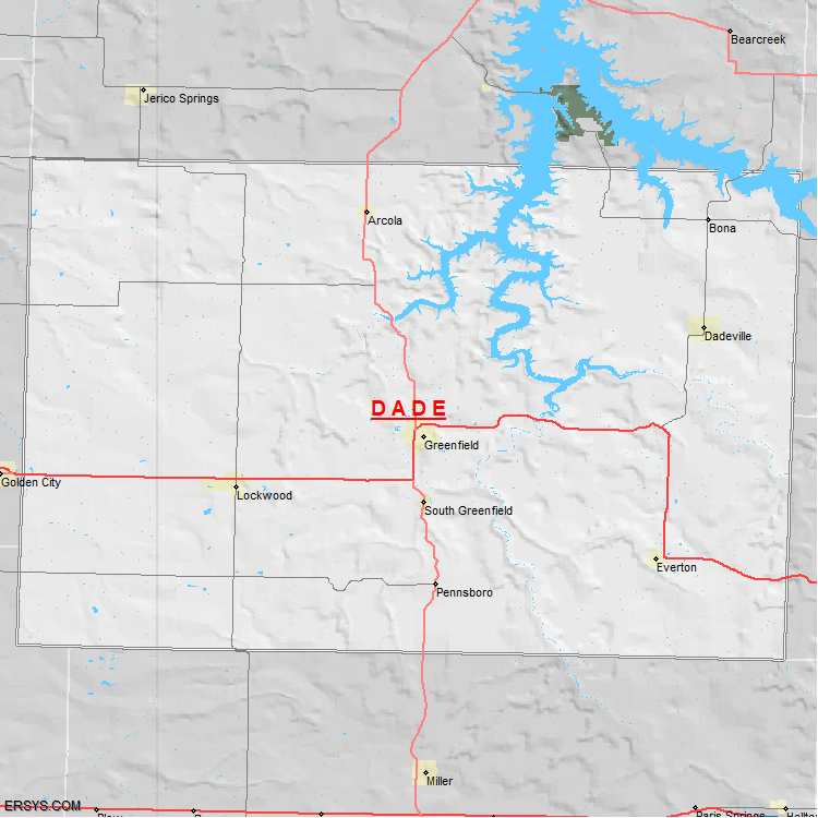 Dade County, MO (shown in white) has 490.01 mi² of land area and 16.24 mi² of water resources. The county is bordered by: