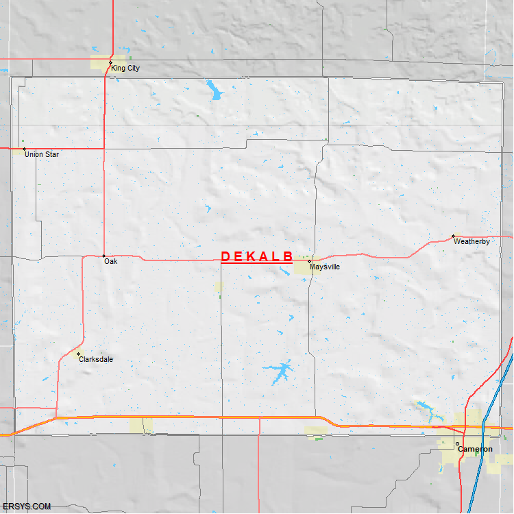 DeKalb County, MO (shown in white) has 421.36 mi² of land area and 4.46 mi² of water resources. The county is bordered by: