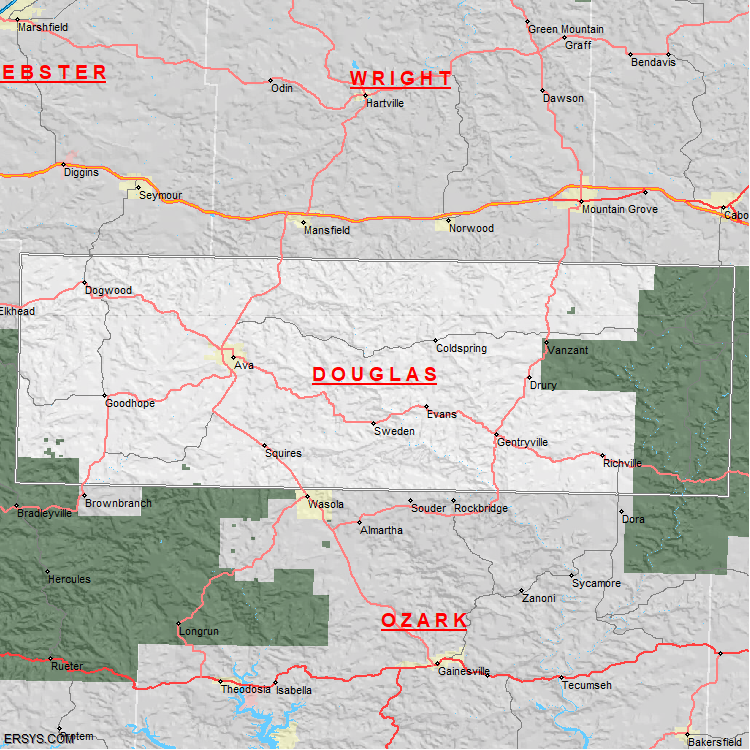 Douglas County, MO (shown in white) has 813.62 mi² of land area and 0.97 mi² of water resources. The county is bordered by: