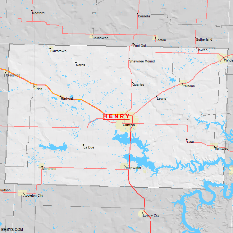 Henry County, MO (shown in white) has 696.94 mi² of land area and 35.39 mi² of water resources. The county is bordered by:
