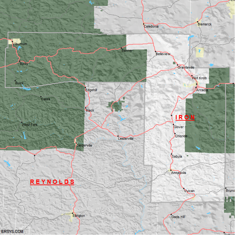Iron County, MO (shown in white) has 550.26 mi² of land area and 1.8 mi² of water resources. The county is bordered by: