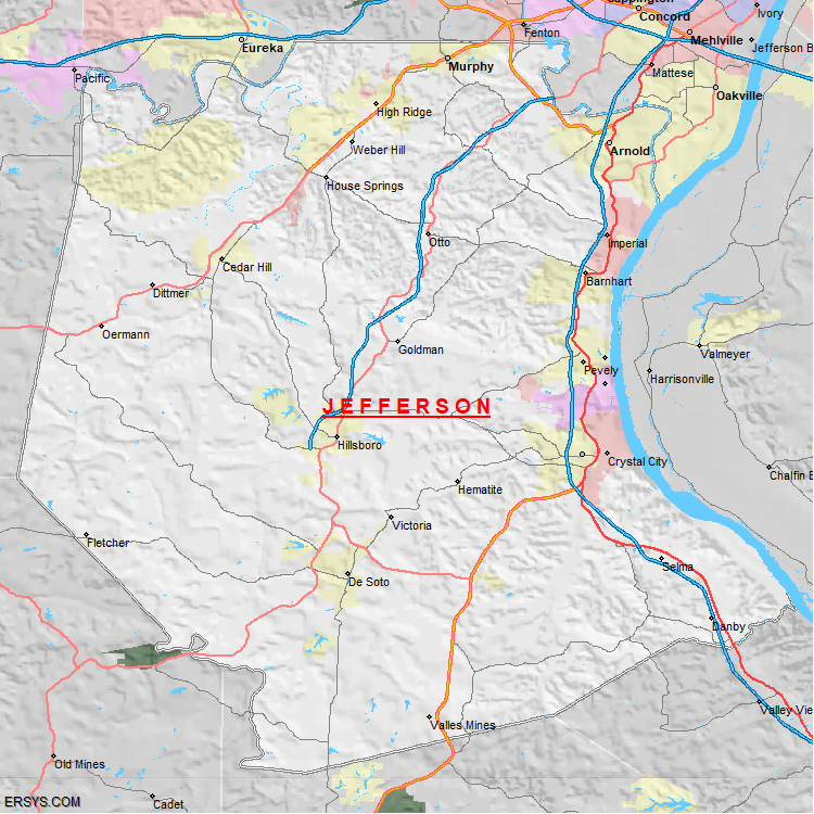 Jefferson County, MO (shown in white) has 656.26 mi² of land area and 7.83 mi² of water resources. The county is bordered by: