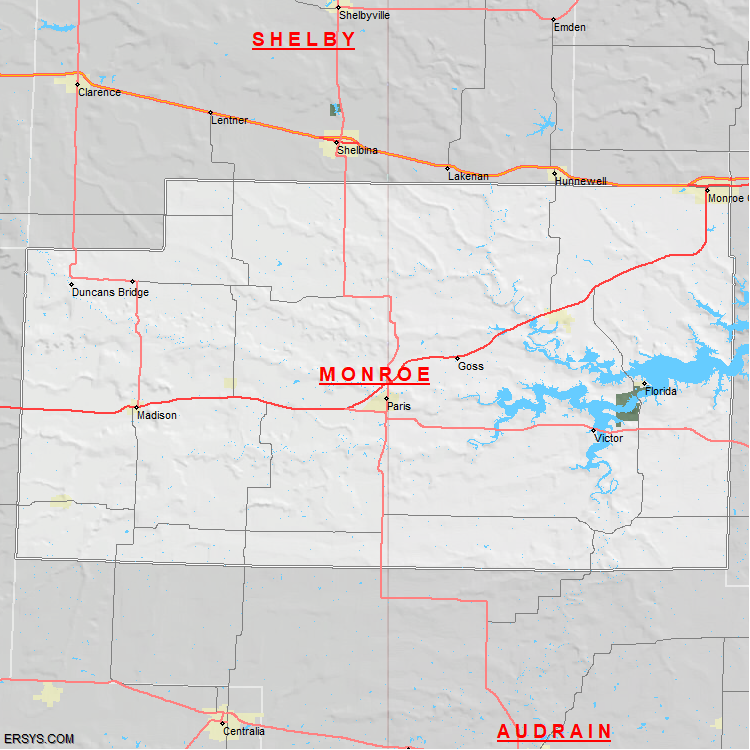 Monroe County, MO (shown in white) has 647.63 mi² of land area and 22.54 mi² of water resources. The county is bordered by:
