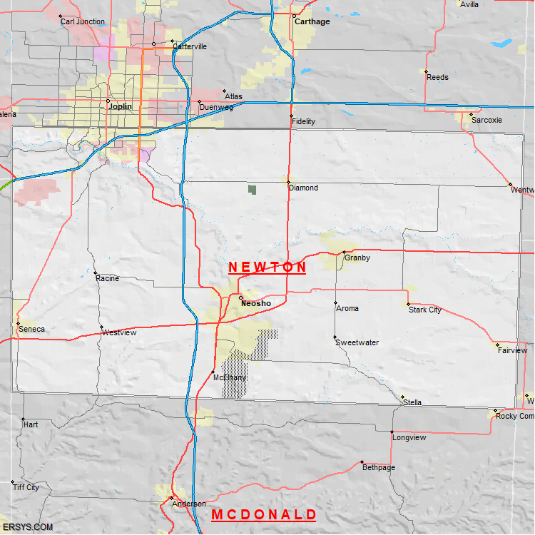 Newton County, MO (shown in white) has 624.75 mi² of land area and 1.82 mi² of water resources. The county is bordered by:
