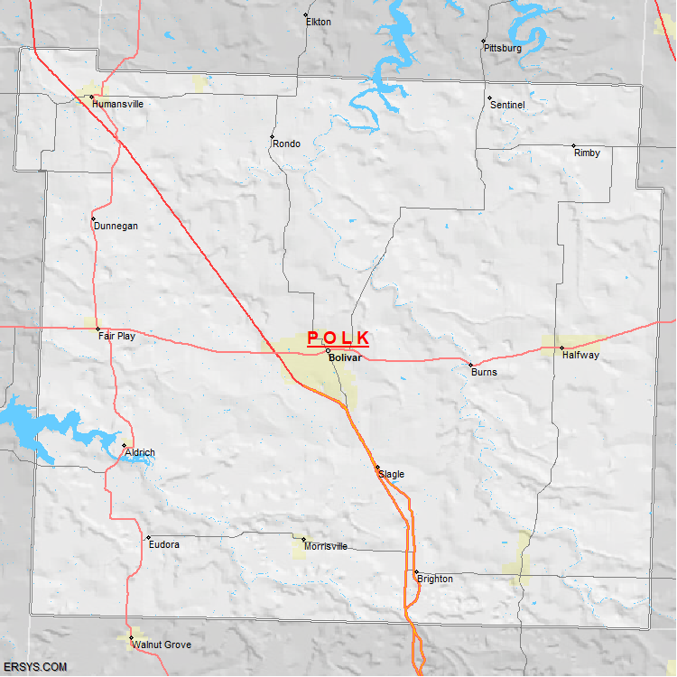 Polk County, MO (shown in white) has 635.53 mi² of land area and 6.89 mi² of water resources. The county is bordered by: