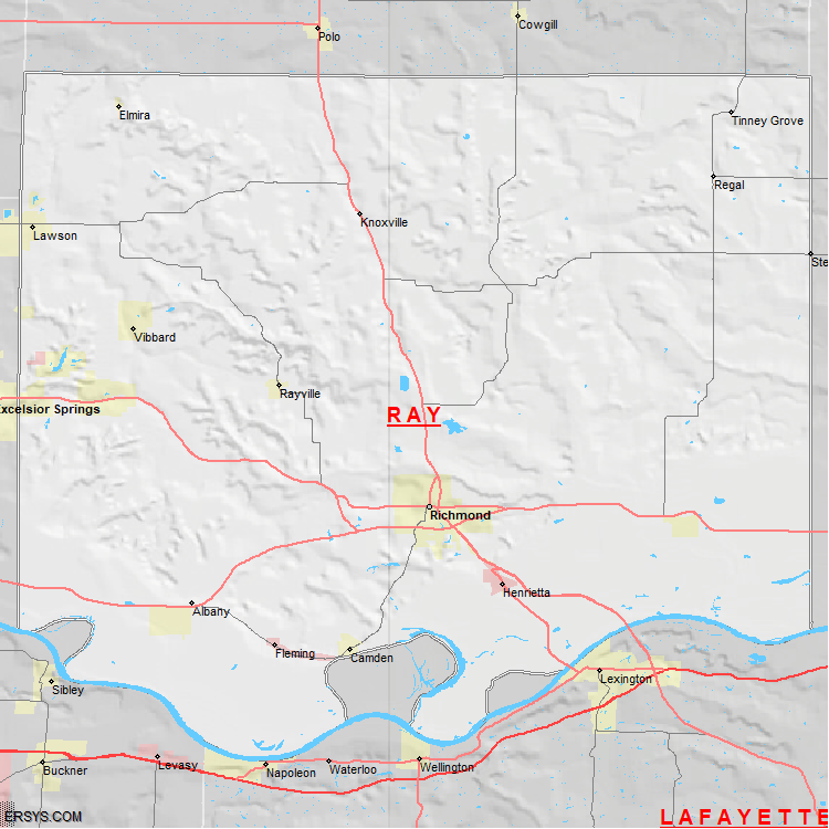 The estimated population of Ray County is 23,460 with 9,199 households. These households are spread across 13 unique municipalties (not all shown).