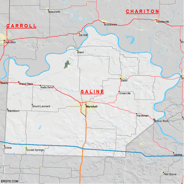 Saline County, MO (shown in white) has 755.51 mi² of land area and 11.41 mi² of water resources. The county is bordered by: