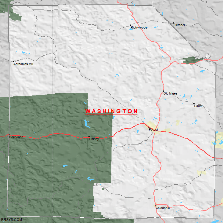 Washington County, MO (shown in white) has 759.87 mi² of land area and 2.62 mi² of water resources. The county is bordered by: