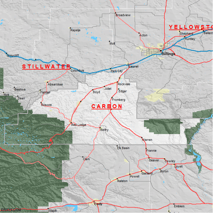 Carbon County, MT (shown in white) has 2,047.78 mi² of land area and 13.6 mi² of water resources. The county is bordered by:
